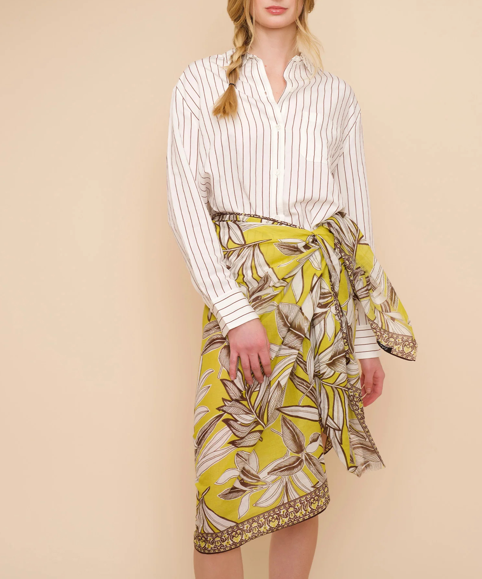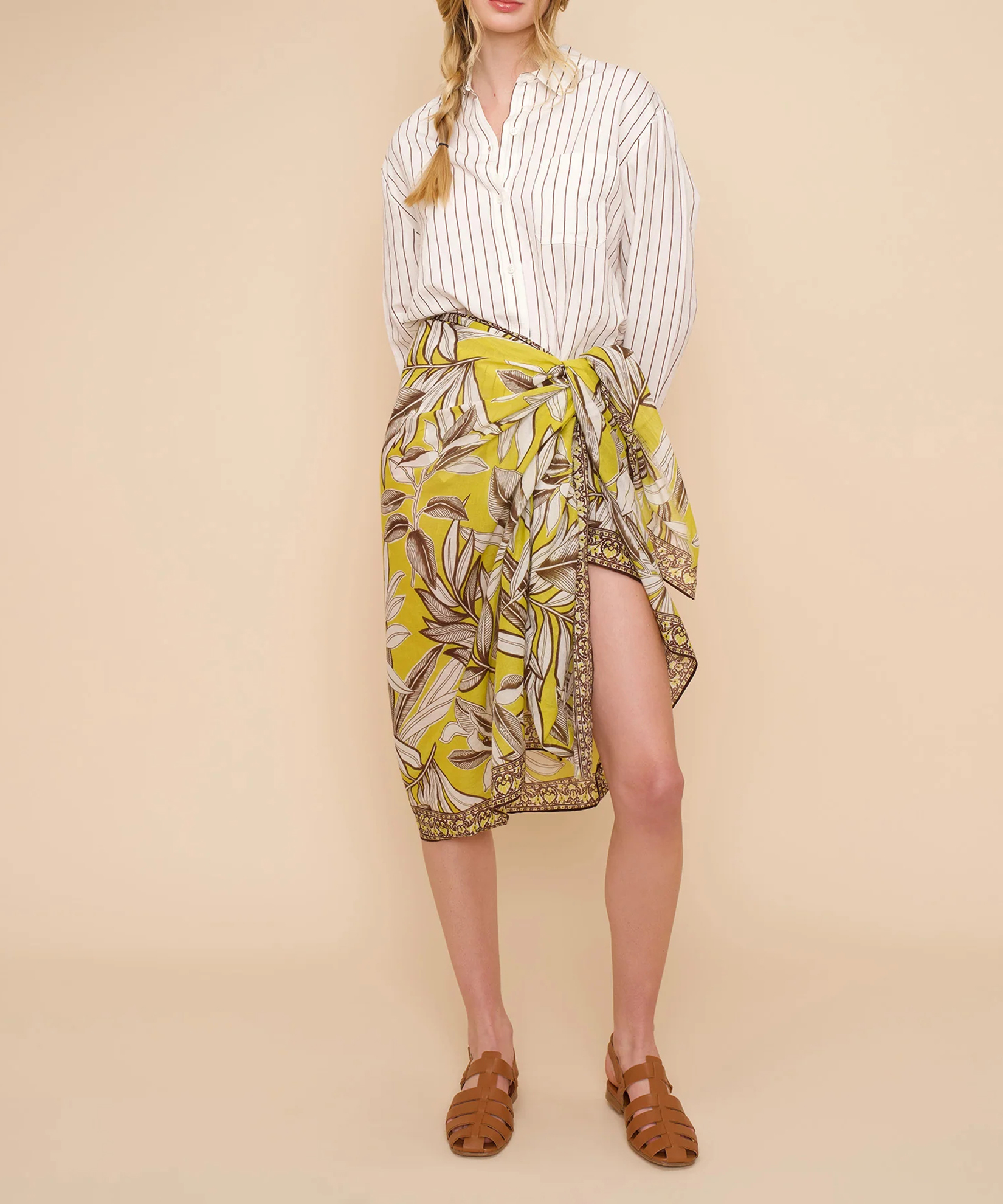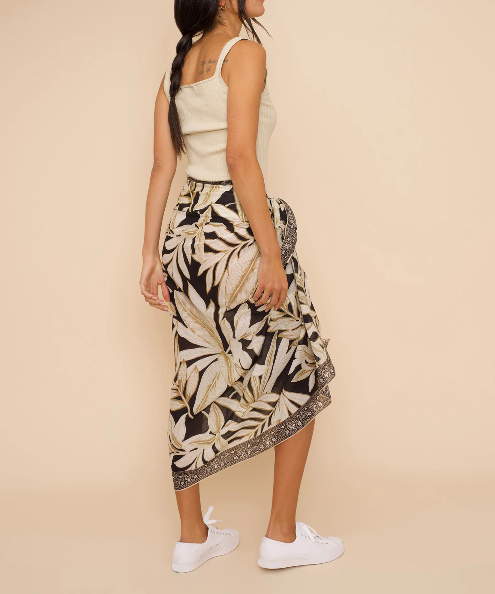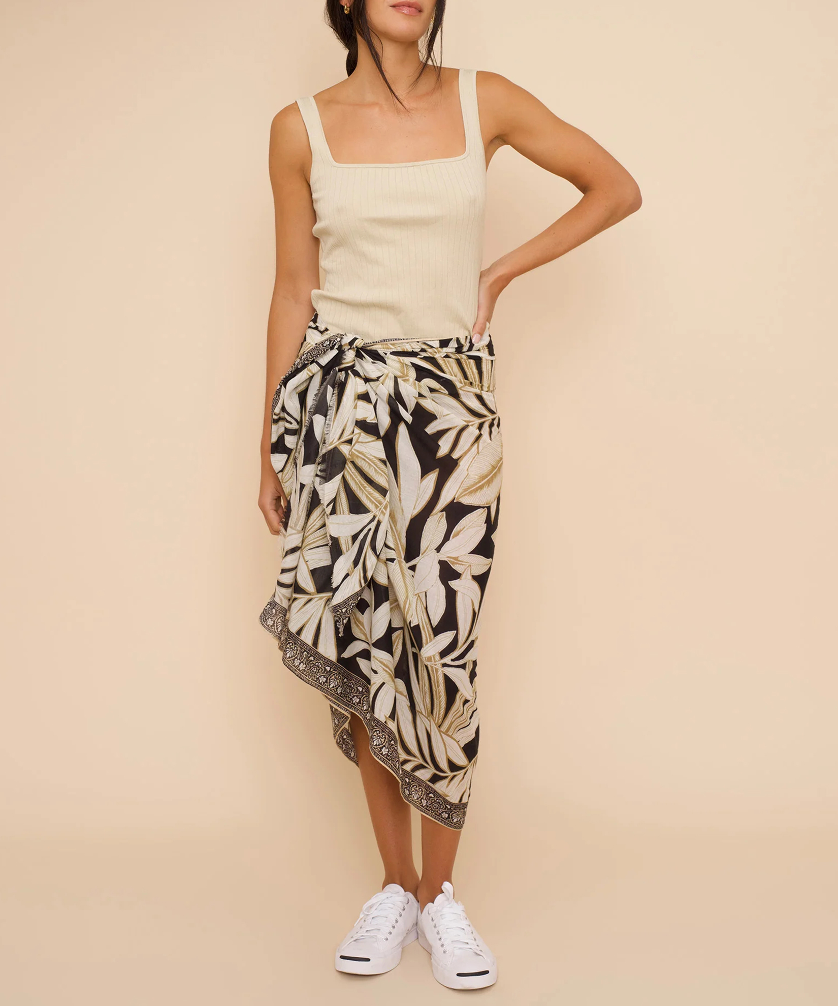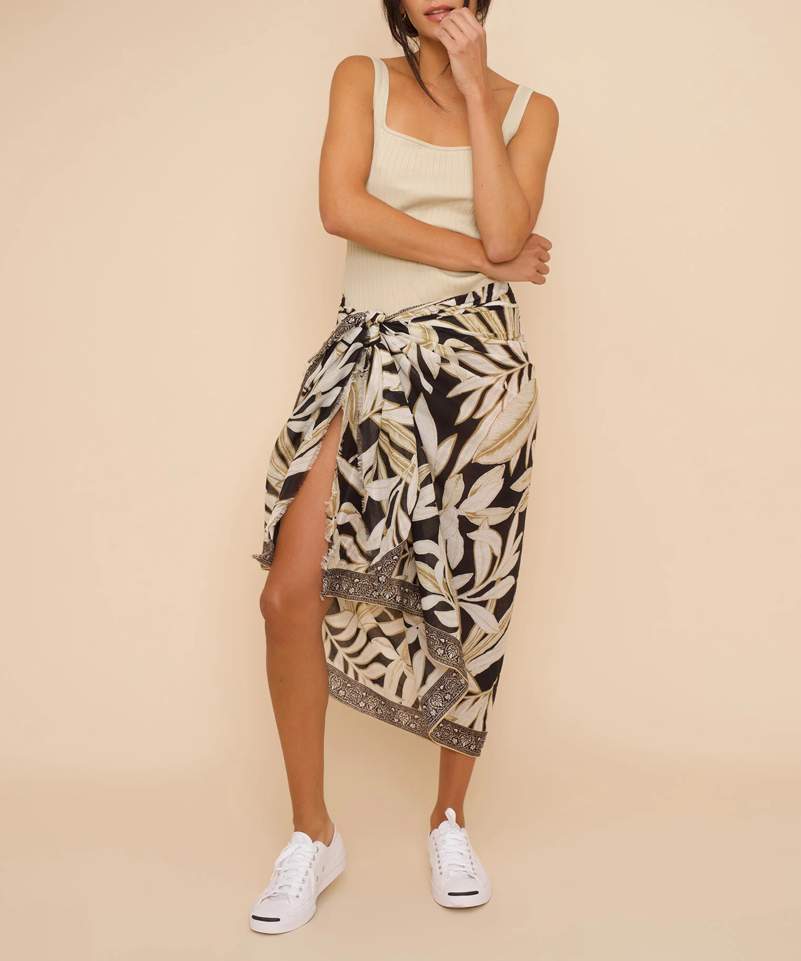 From the beach to the street, this versatile sarong is crafted from pure cotton and features a palm print.